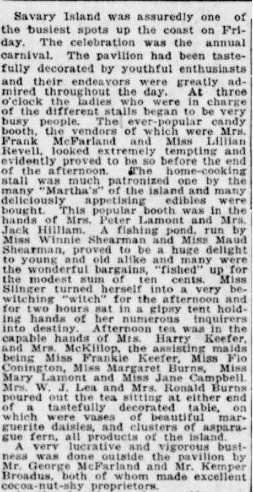 In the 1920s, the residents of Savary (both full-time and part-time) used to put on an annual carnival in August. Below is a report that appeared in the August 9, 1921 edition of the Vancouver Daily World describing the festivities at Savary Island for its Vancouver readership.